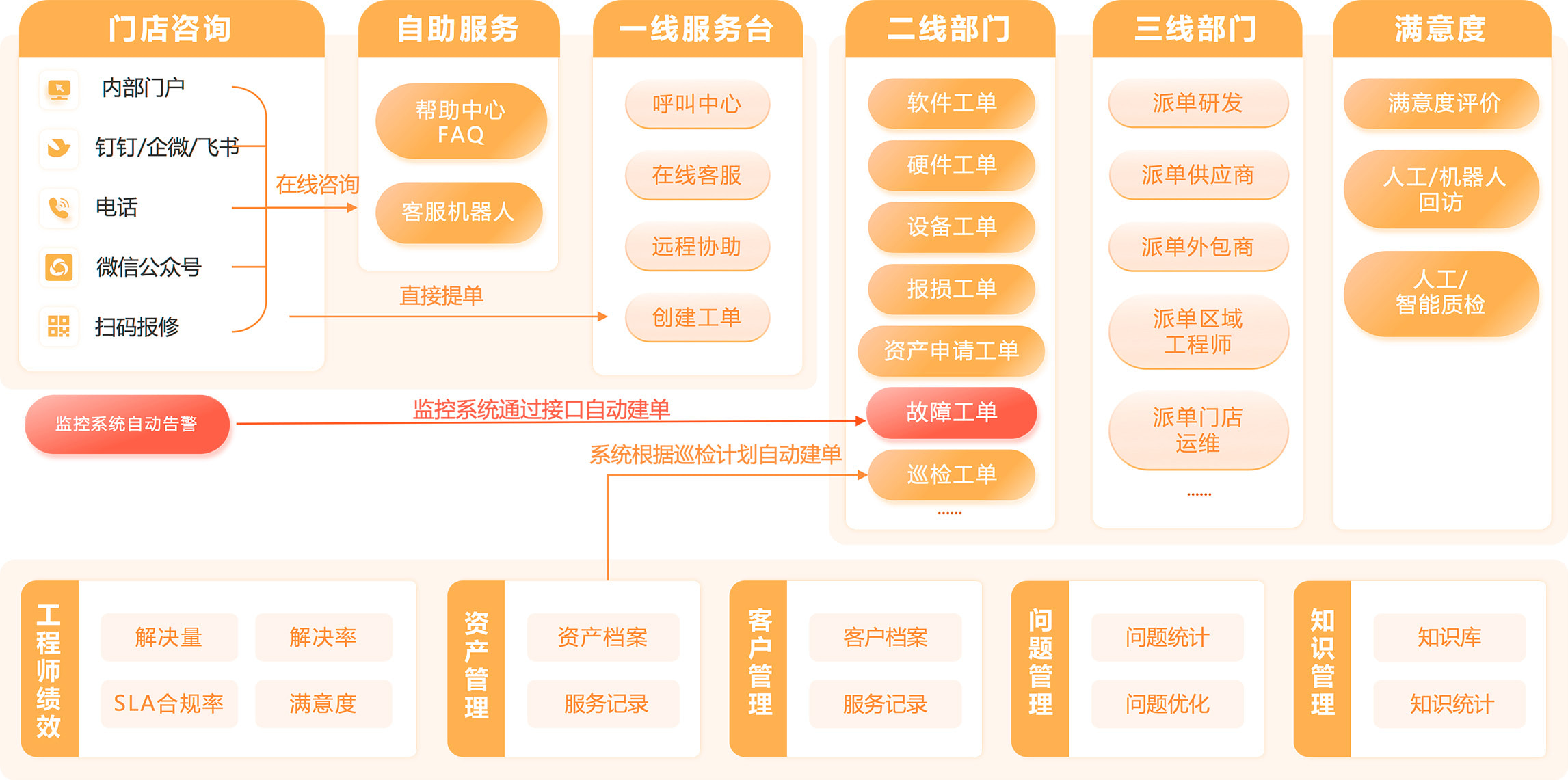 工单可根据既定流程,在各部门、供应商等组织之间智能派单、自动流转,实现流程标准化,提升协作效率,平均解决时间缩短50%以上,更好的保障门店不间断运营。